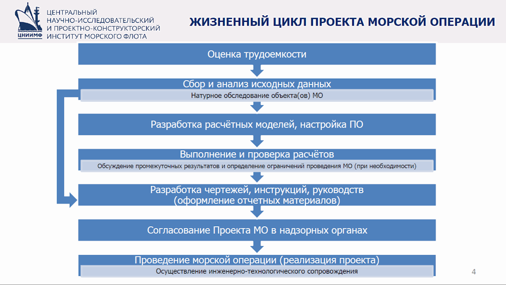 Особое внимание Алексей Петров уделил описанию жизненного цикла проекта морской операции, в котором выделил наиболее значимые этапы: натурное обследование объекта при сборе исходных данных, обсуждение промежуточных результатов и назначение ограничений в ходе выполнения расчетов, инженерно-технологическое сопровождение при реализации проекта.