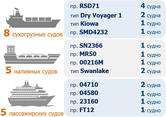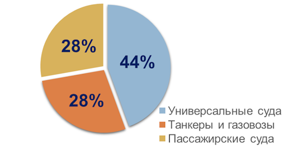 В структуре поставок по назначению можно отметить преобладание сухогрузных судов – восемь единиц (44%). Наливной и пассажирский флот получили по пять судов.